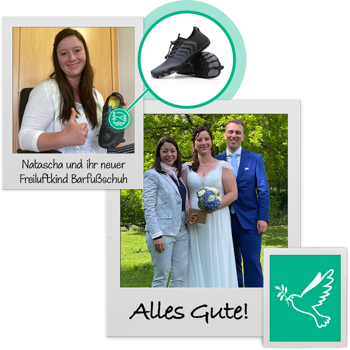 "Liebes Freiluftkind-Team, den schönsten Tag habe ich "barfuß" verbracht. Man hat sie nicht sehen können, jedenfalls nicht oft. Ich hatte die Schuhe bei meiner Hochzeit an und war begeistert. Durchgetanzt bis 3 Uhr keine Blasen.. dafür bin ich sehr dankbar. Leider ist der tolle Tag so schnell vorbei .. aber die Schuhe sind so toll - jetzt trage ich sie jeden Tag. Bester Altagsbegleiter auf der Arbeit - der Schuh fällt nicht auf und ist schön luftig. Ich muss mir umbedingt ein zweites paar Paar bestellen.. oder 3.. mal sehen.