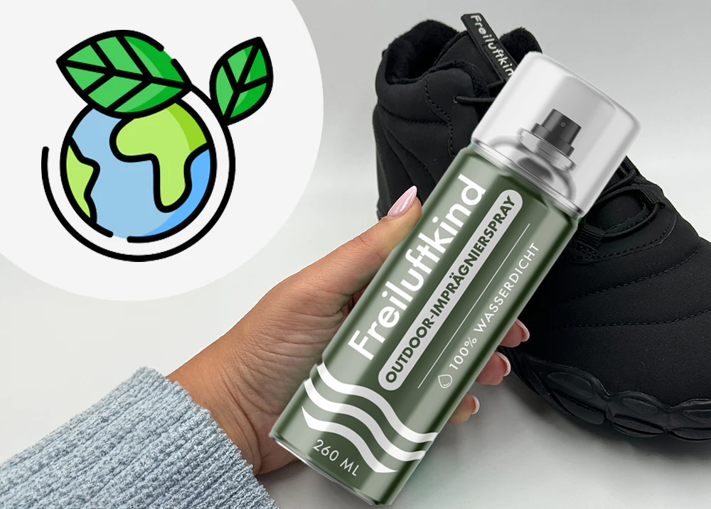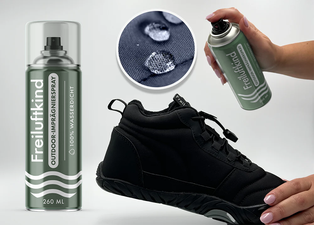 Entdecke das Freiluftkind Outdoor-Imprägnierspray: Dein zuverlässiger Begleiter, um deine liebsten Barfußschuhe vor Regen und Schmutz zu schützen. Mit unserer innovativen Formel bieten wir dir eine langlebige Lösung, die dich durch jede Wetterlage begleitet und selbst auf atmungsaktiven Membranen angewendet werden kann, ohne deren Funktion zu beeinträchtigen.