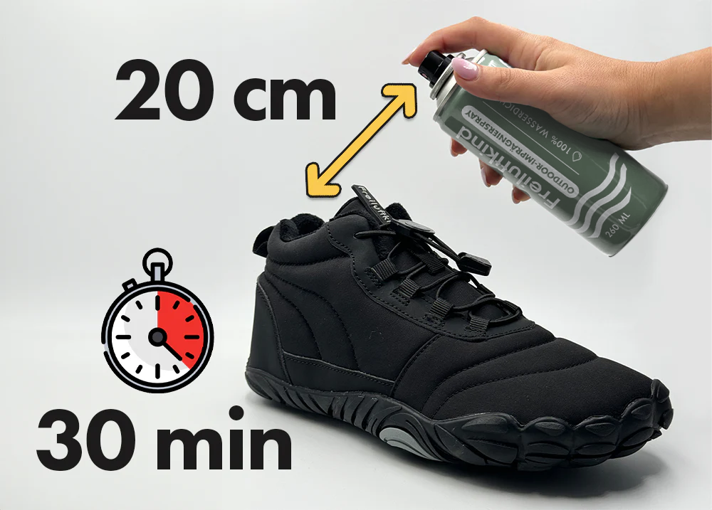 Die Anwendung ist denkbar einfach: Schüttle das Spray gut, halte es etwa 20 cm vom Schuh entfernt und sprühe die saubere und trockene Oberfläche kurz ein. Nach nur 30 Minuten Trocknungszeit entfaltet das Spray seine volle Wirkung und hinterlässt einen unsichtbaren Schutzfilm, der Regen und Schmutz abweist.